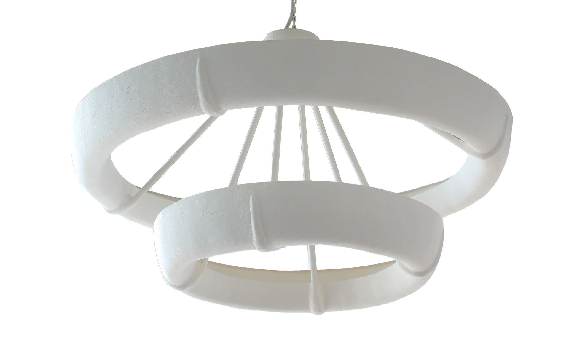 The Double Aura hanging light makes a confident sculptural statement to any space. Handcrafted from feather-light fiberglass, it's generous scale attracts attention while still feeling un-intrusive. The aura emits a soft, diffused glow.