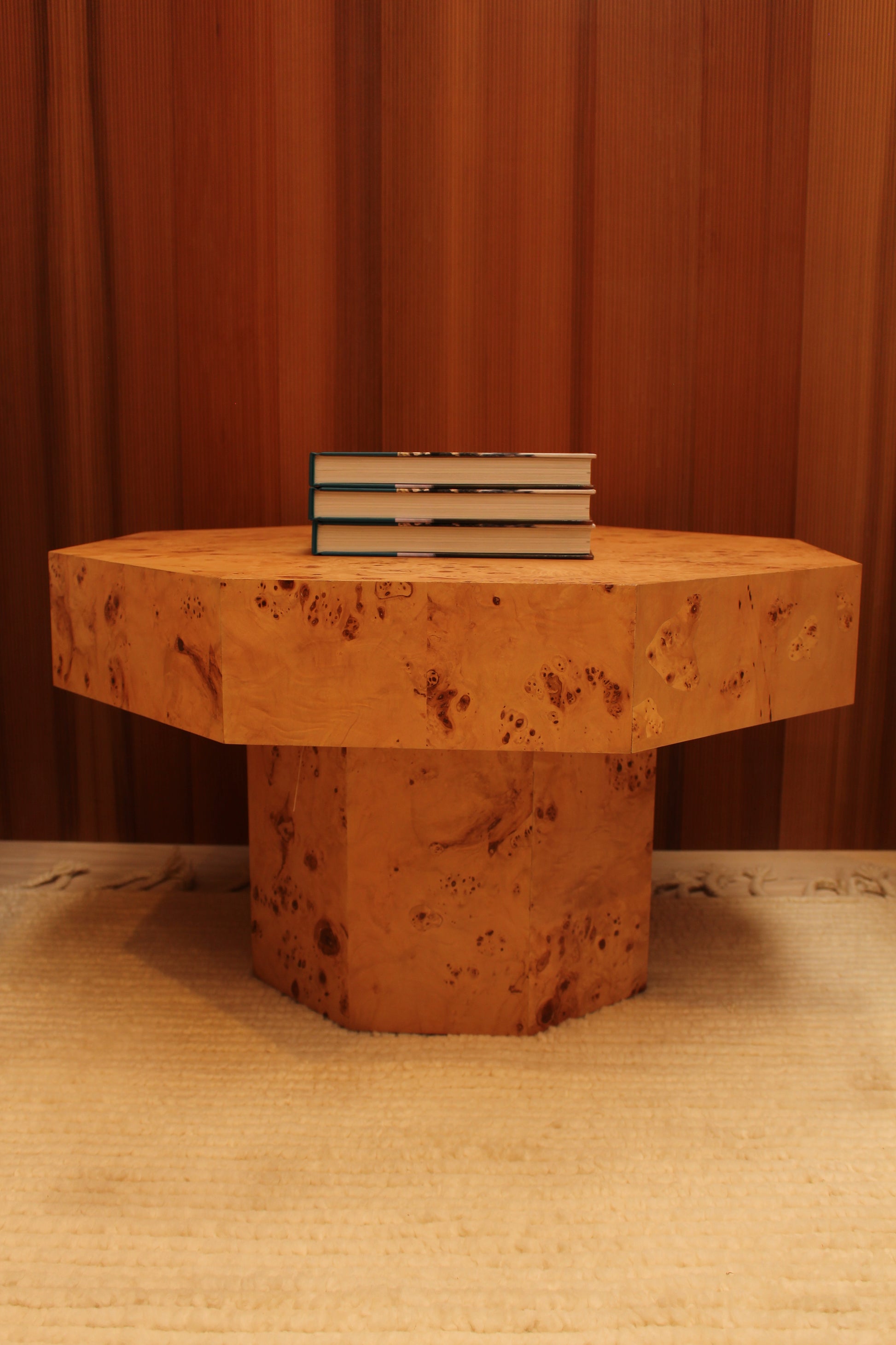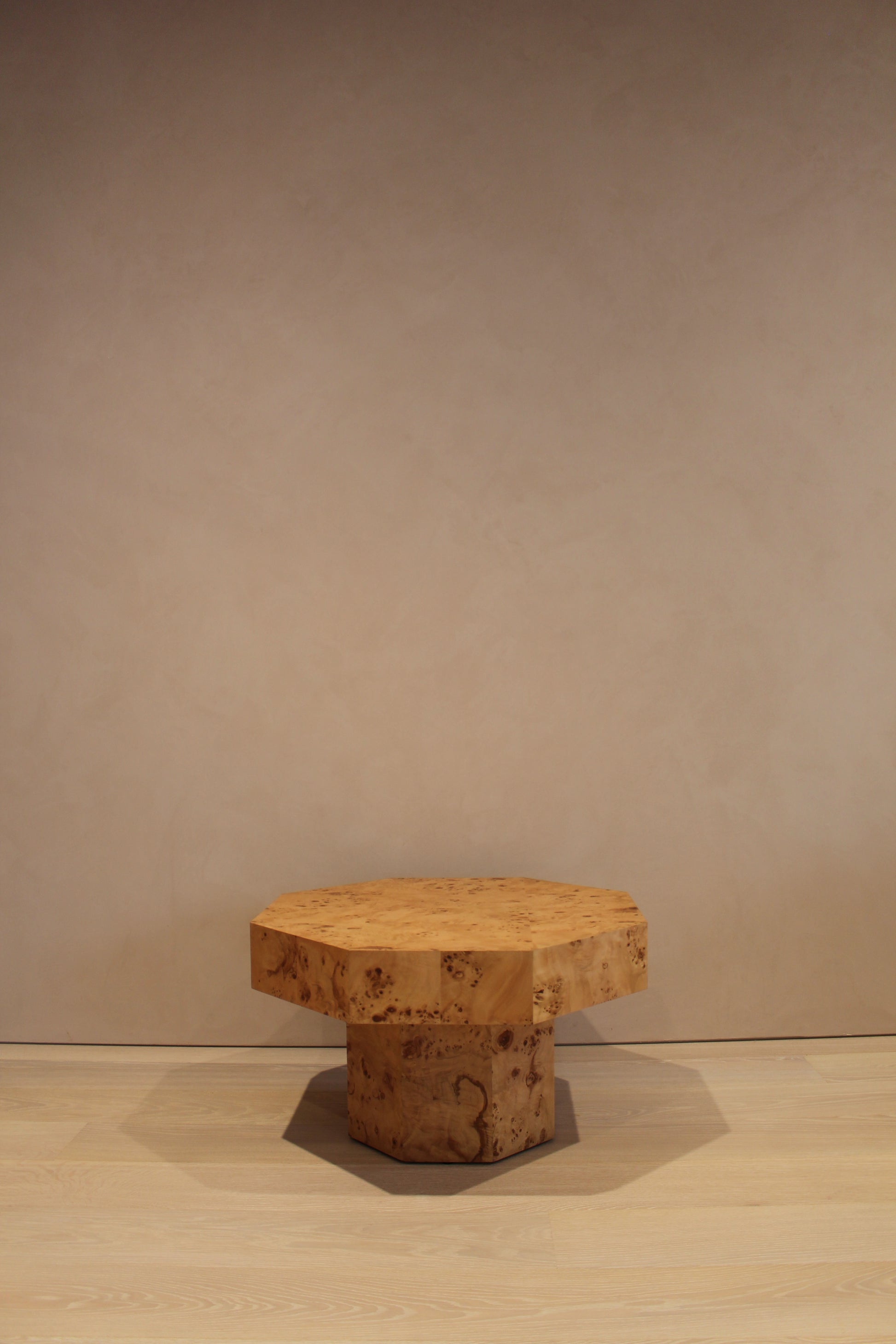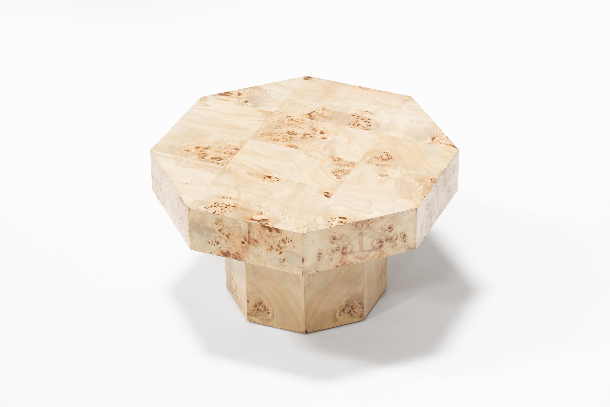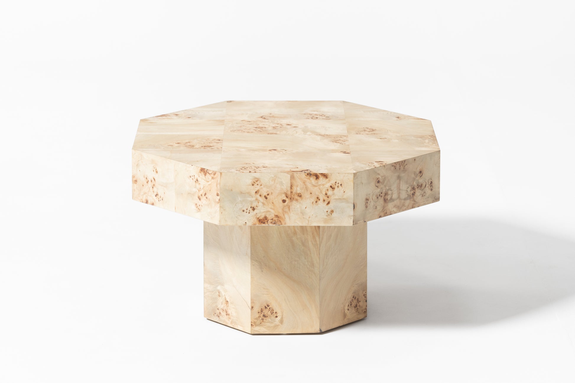 The Baka coffee table features an octagon-shaped top and base, showcasing an innovative design crafted from midi wood and MDF veneer with a distinctive mappa burl effect. This combination offers both durability and a sophisticated aesthetic, making it a refined centerpiece for any living space. Its unique shape and textured finish highlight expert craftsmanship and contemporary style.