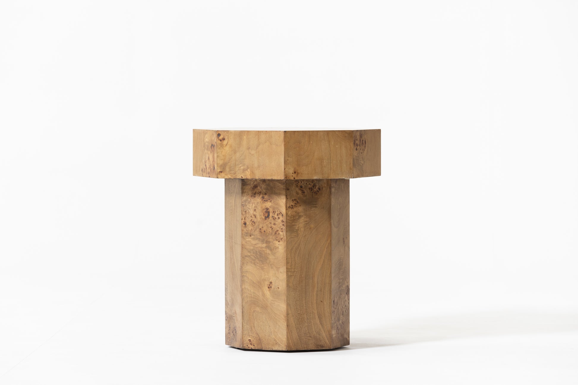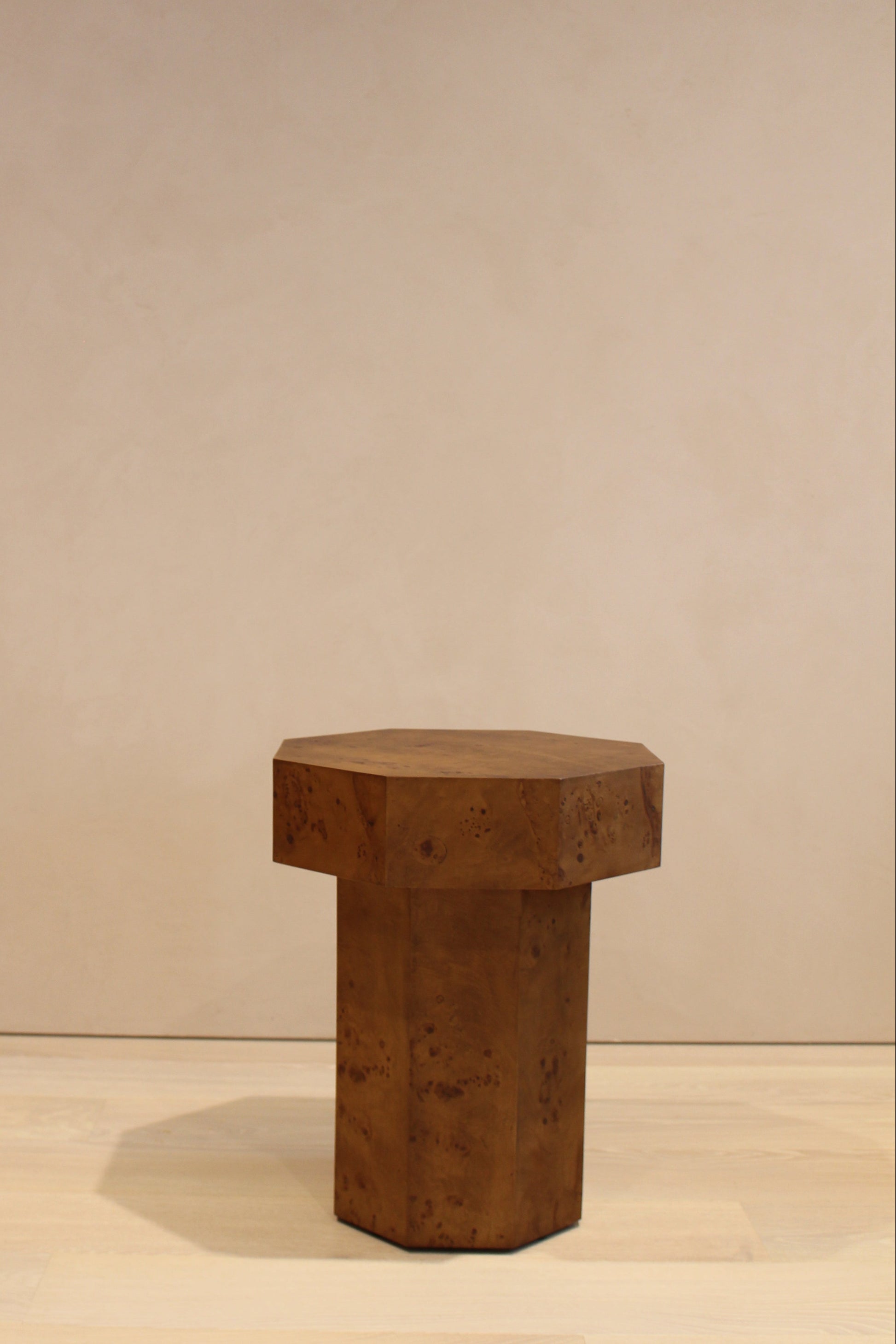 The Baka side table features an octagonal design with a midi-sized top and base crafted from MDF veneer showcasing a sophisticated mappa burl effect. This combination offers both durability and a refined wood appearance, making it an elegant and practical addition to contemporary interiors. Its unique shape and textured finish provide a distinctive focal point while maintaining functional versatility.