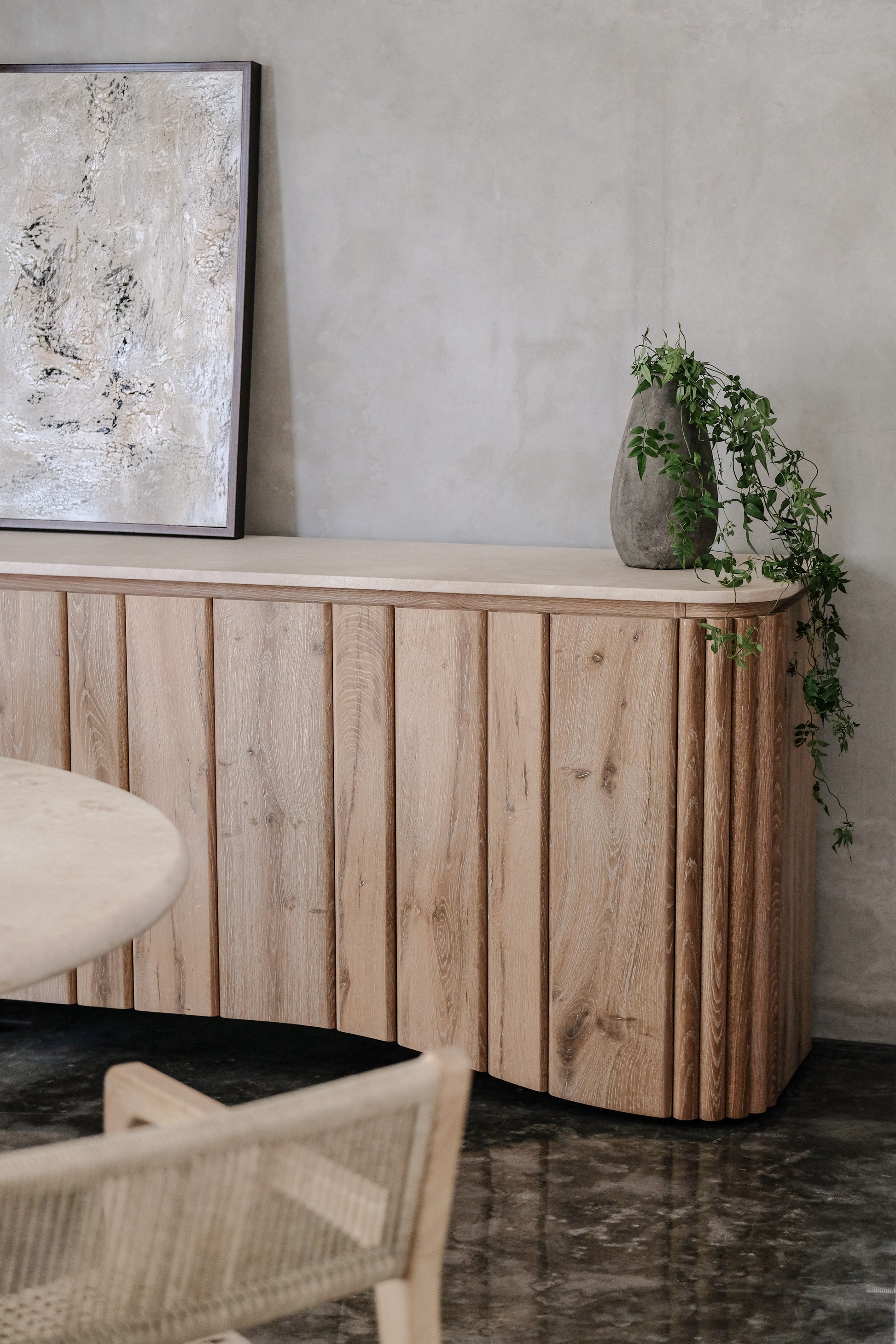 Masterfully combining movement and modernity, the design of the Calibre Sideboard is defined by elegant curves that create a sense of fluidity, while the vertically arranged wooden pieces add a contemporary flair. An iconic and modern design that doesn't go unnoticed.