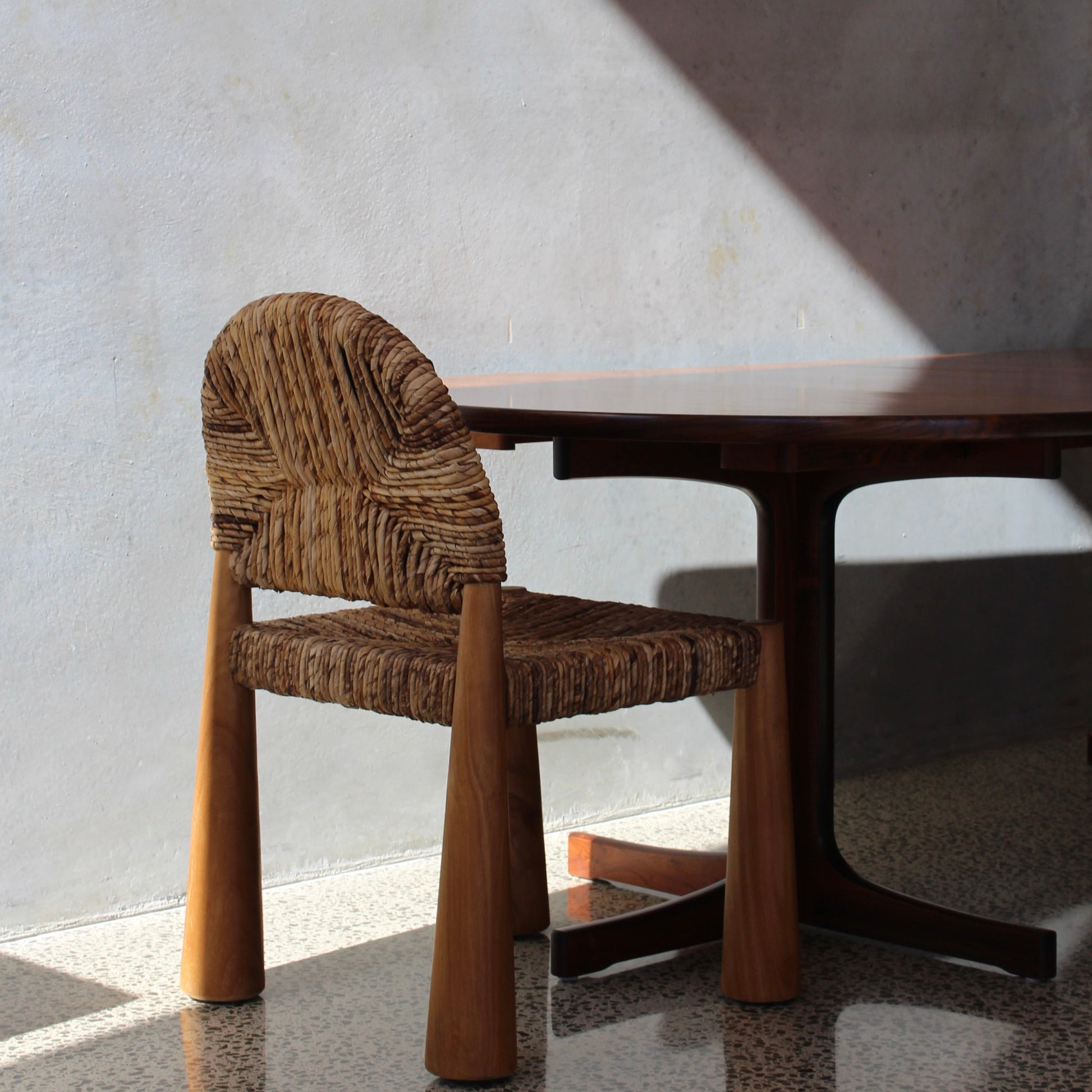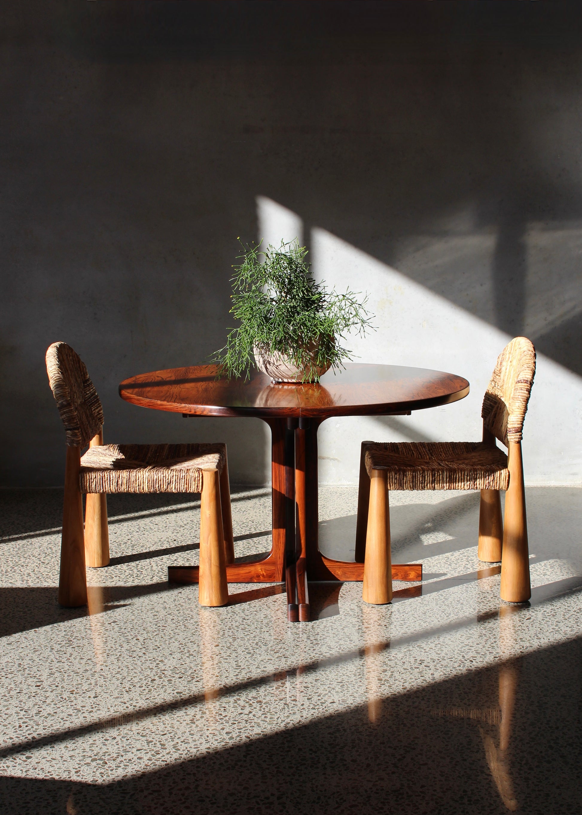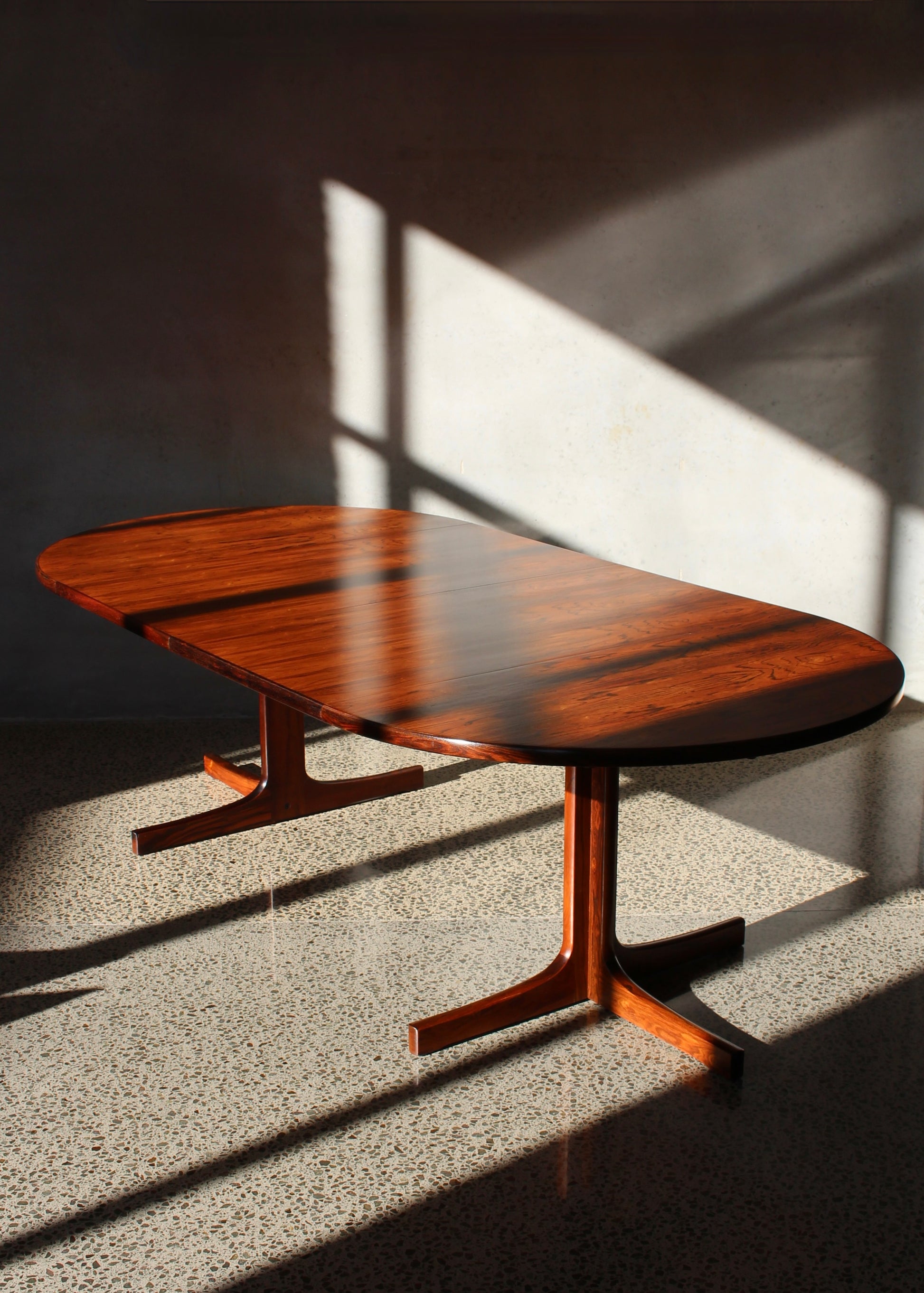 This Danish Midcentury Modern dining table by Niels Moller, produced by Soren Willadsen in Denmark during the 1960s, showcases exceptional rosewood craftsmanship. Its round design seats four when closed and extends with two leaves to welcome additional guests. The table offers three adjustable sizes by removing or adding pieces, a task manageable by a single person, blending refined aesthetics with adaptable functionality.