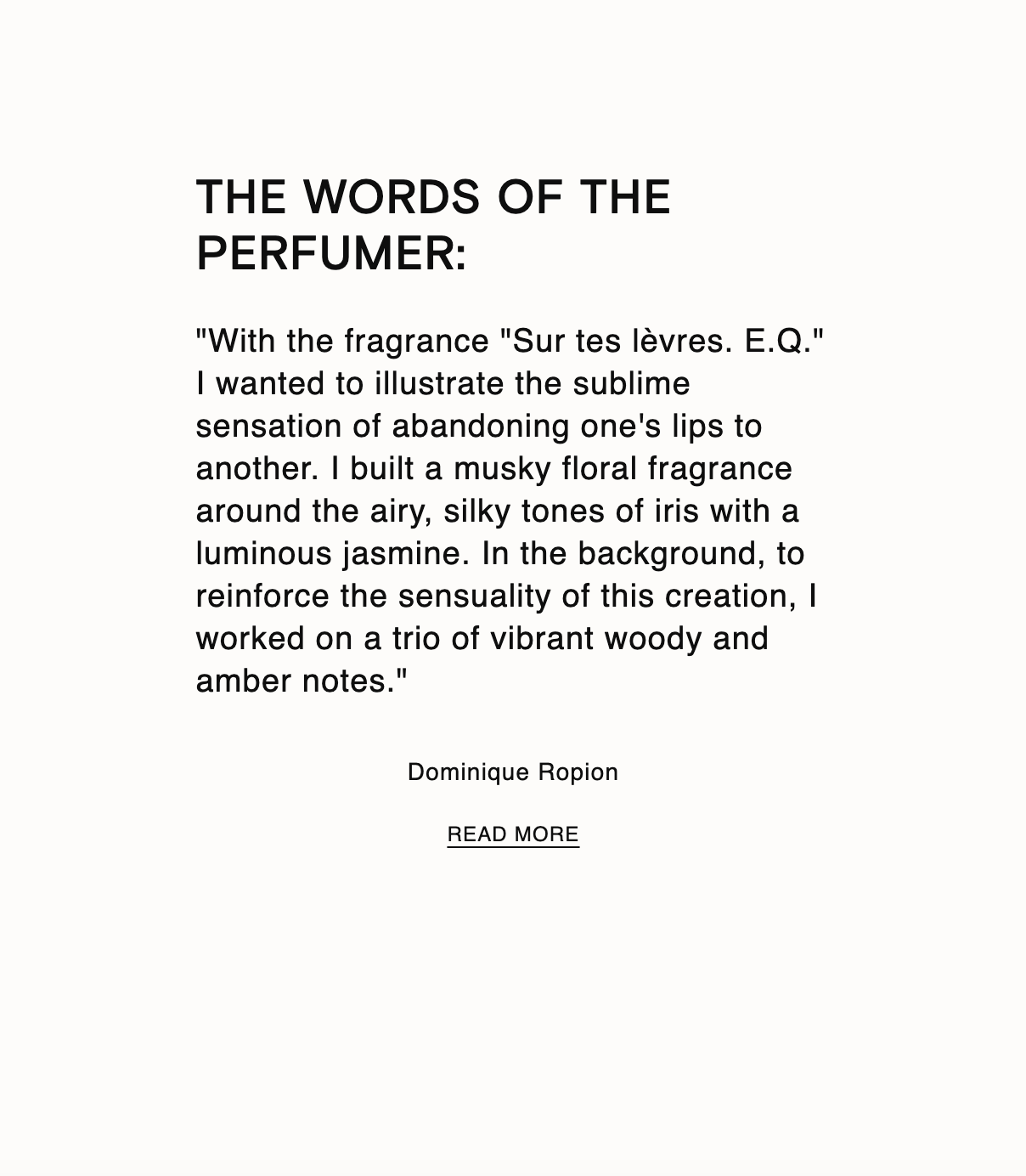 A Floral, Musky Eau de Parfum evoking endless love, imagined as the extension of a kiss by master perfumer Dominique Ropion for D'ORSAY.