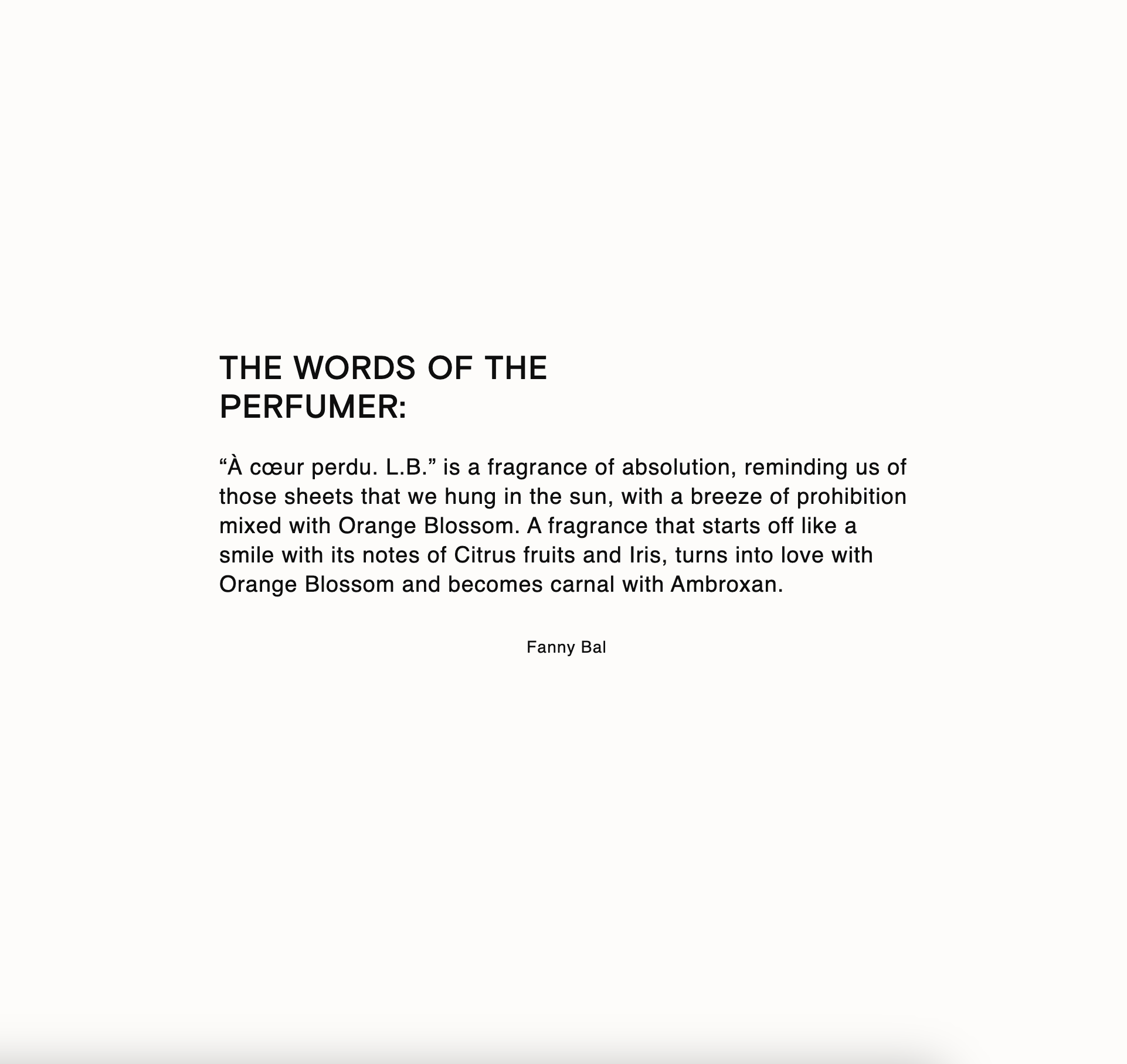 It is a fragrance of absolution with a hint of Iris, a wind of forbidden mixed with Orange Blossom.