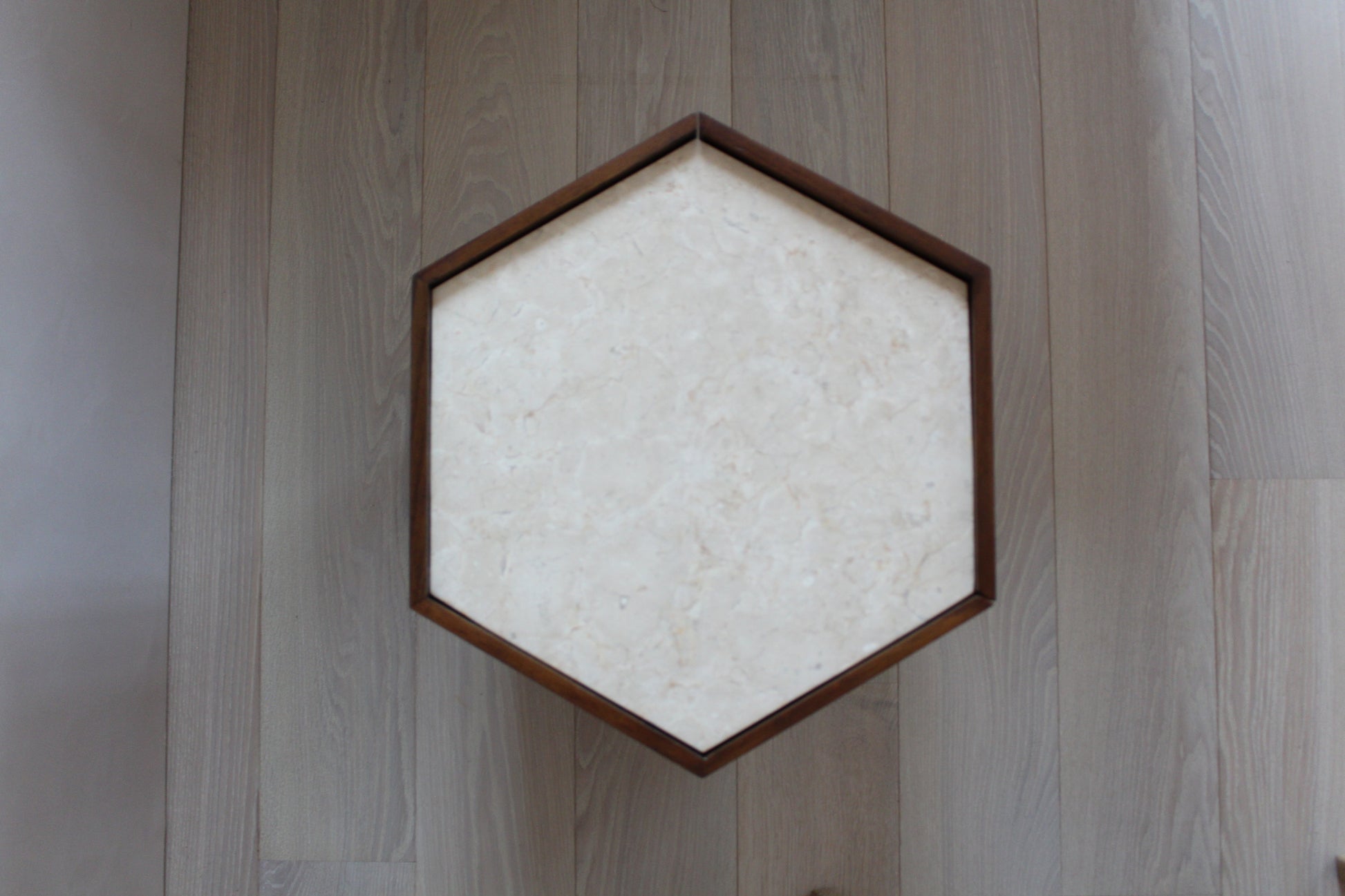 The Hexagon Side Table features a sophisticated marble top veneer paired with a durable mindi wood frame, combining elegance with sturdy craftsmanship. Its geometric design adds a modern touch to any space, while the quality materials ensure lasting durability. Ideal for enhancing your living area with both style and function. Left and Right door options available.
