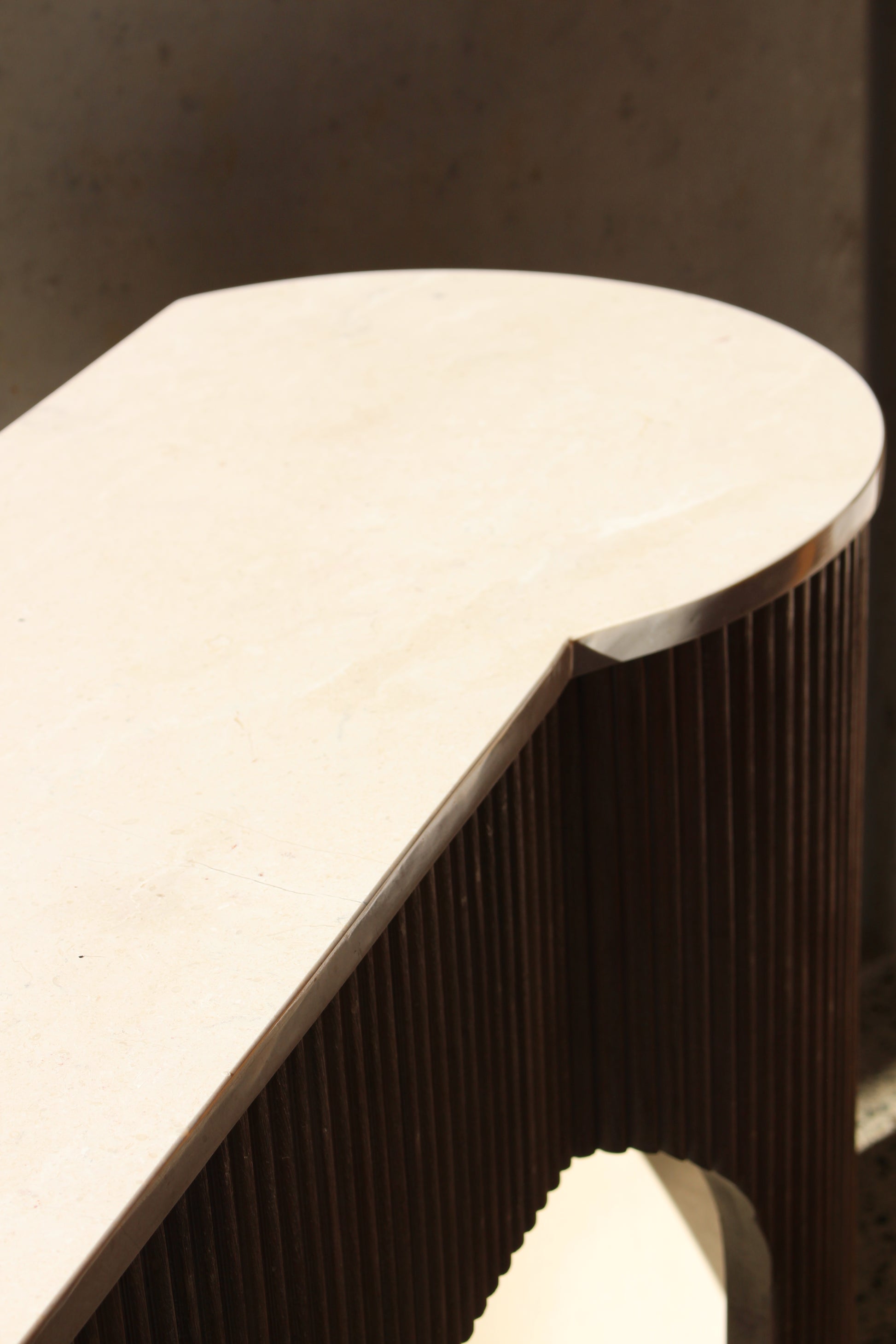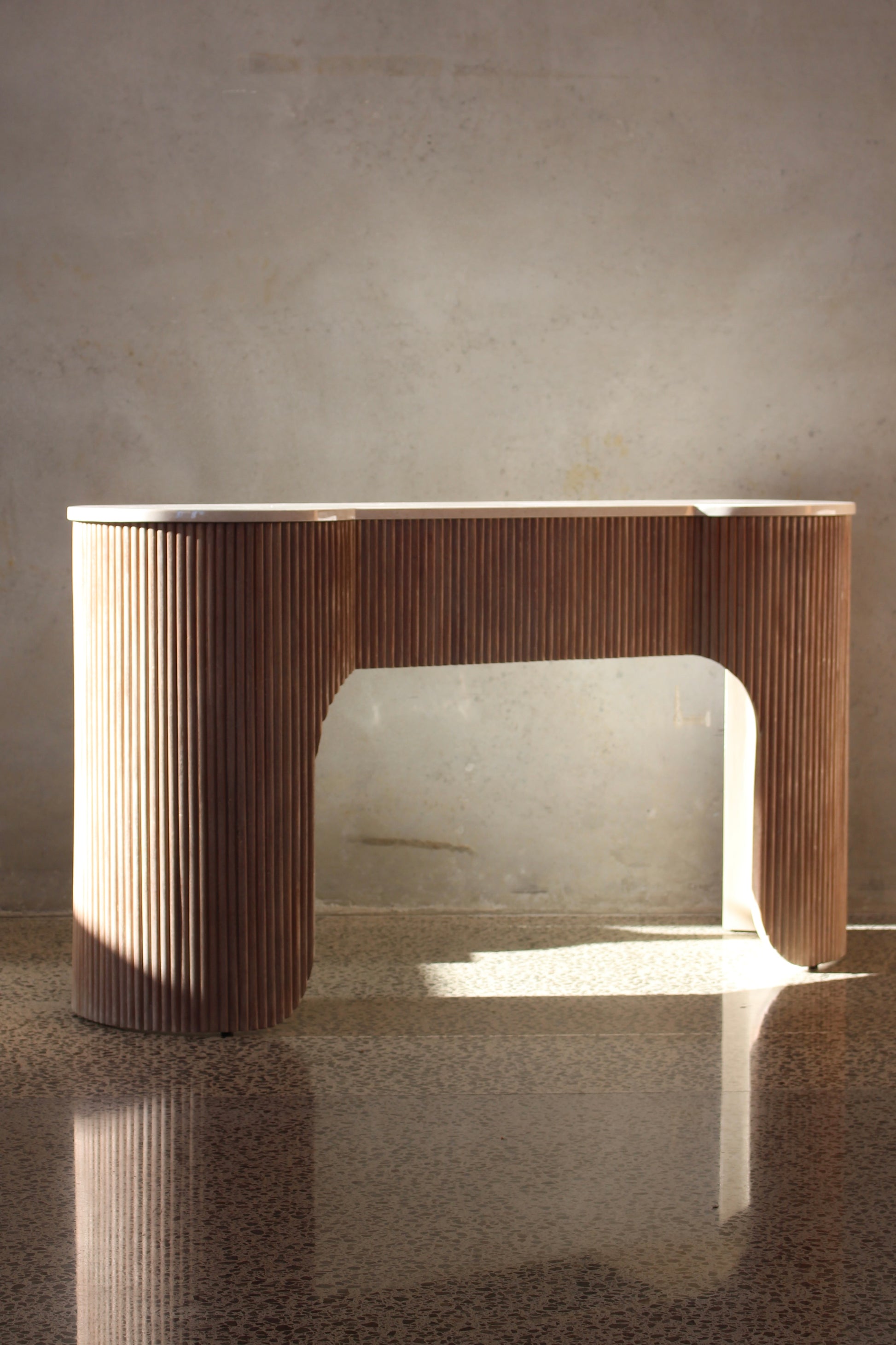 Lina console table demands to be seen. The combination of light oak wood and marble top embodies elegance and luxe. The rounded leg shape creates an arch that opposes the vertical detail on the wood.
