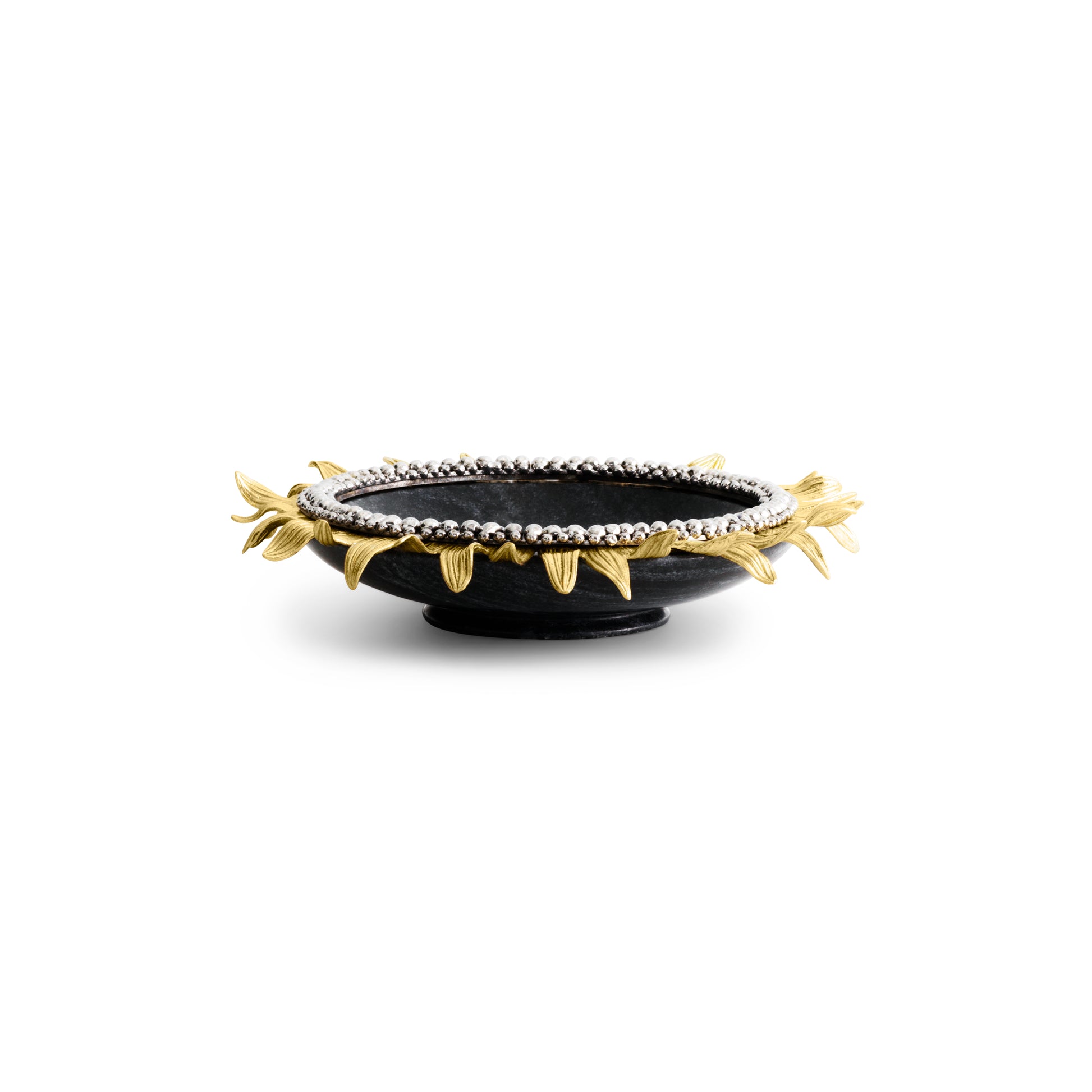 The Michael Aram Vincent Collection trinket tray celebrates the sunflower. Symbolic of hope and optimism, it is a flower that is ordinarily represented with bright yellows in sweetly romanticized renditions. In Michael's interpretation, he expresses a less conventional view of the flower. Inspired by the more earnest and frenetic spirit of Vincent Van Gogh's legendary paintings, Michael chose to embody the contorted, almost threatening beauty of the bloom as it transitions through each stage of its existence.