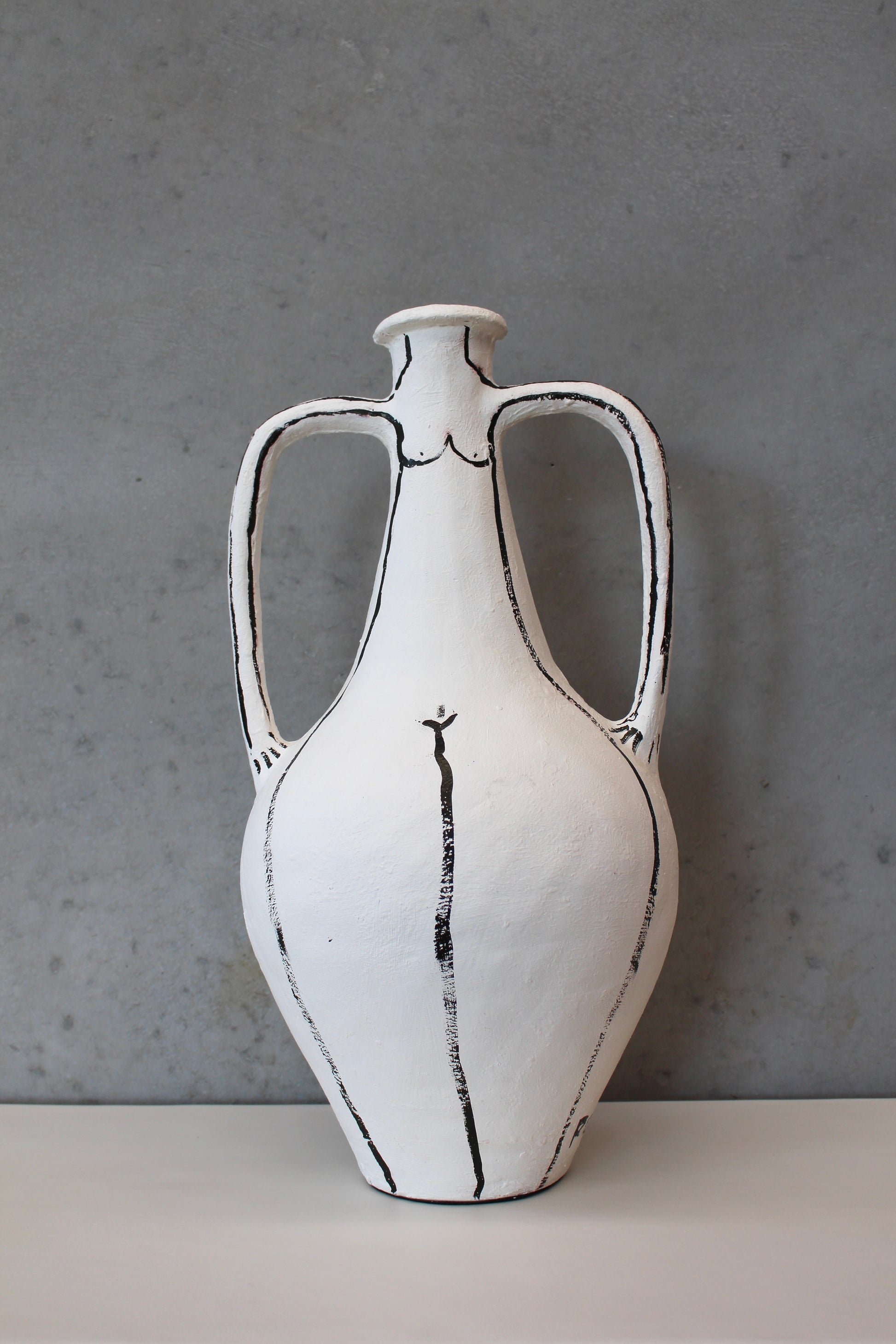 This is a handcrafted vase, in the size medium, with a textured finish and two symmetrical long handles. The front features a minimalist, hand-drawn illustration of a woman's body by the popular artist RizzRizzRizz, adding a bold yet artistic touch. Perfect for modern or eclectic interiors, this vase can serve as a standalone decorative piece or as a container for dried flowers.